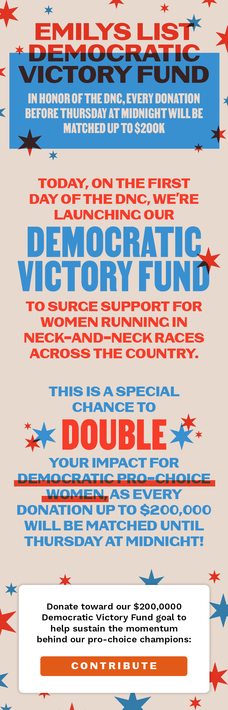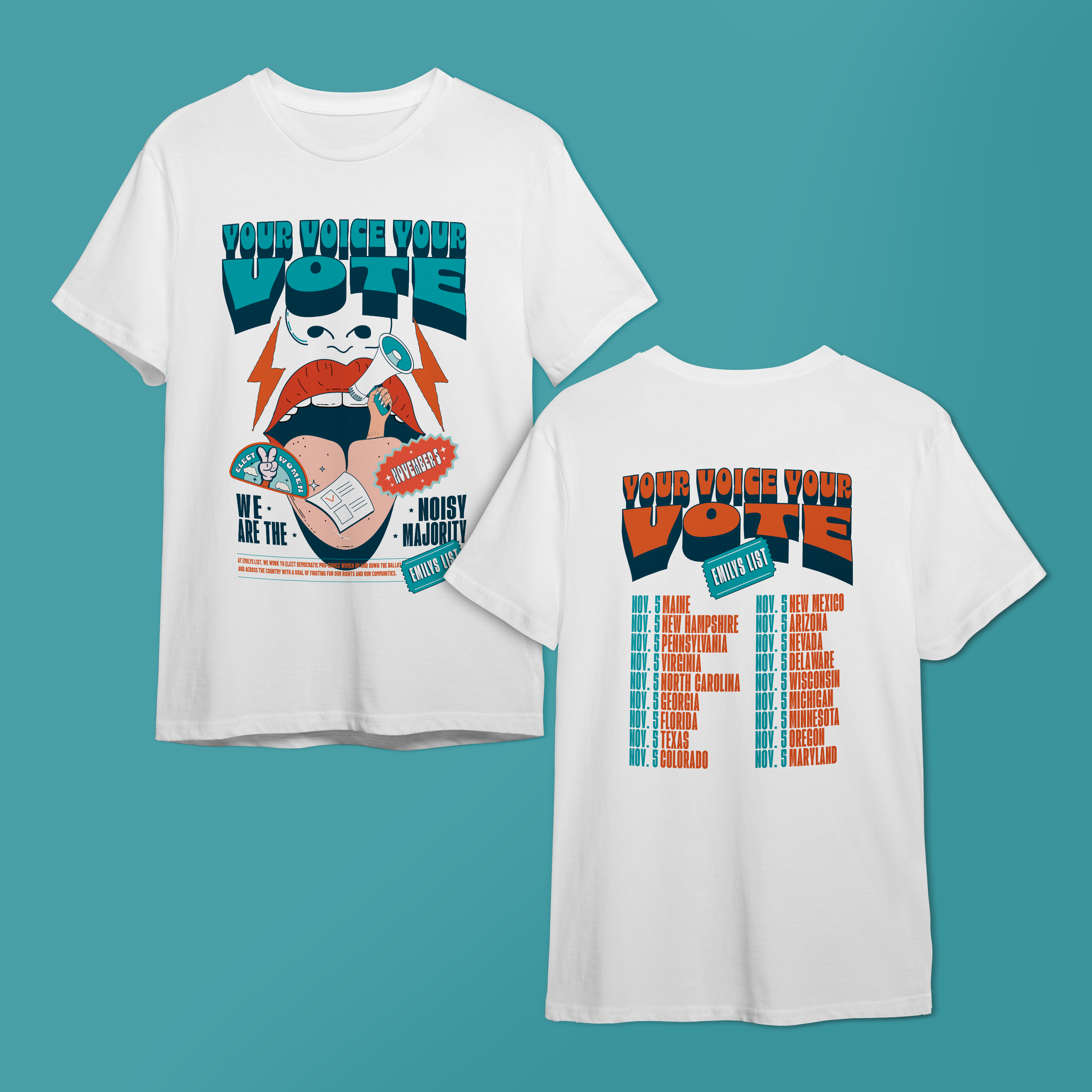 I joined EMILYs List, a fundraising organization for Democratic women running for office, as a designer in 2022 and became the Deputy Creative Director in 2024. During my time there I created social graphics, fundraising emails, and merch designs. I worked on social strategy, coming up with concepts for campaigns. I designed staging and materials for events. I managed a team of designers and interns. I collaborated with printers and outside partners, as well as those in higher positions in the organization. I traveled to the DNC to help sell merch and make onsite graphics for our team.